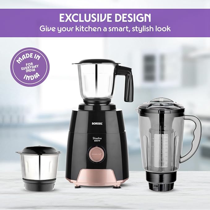 From your morning chutney to evening masala prep, the Borosil Silverline Mixer Grinder is designed to make everyday Indian cooking effortless. Powered by a high-performance 600W turbo motor, it delivers smooth and consistent grinding—even for tough ingredients like spices, dals, and coconut.