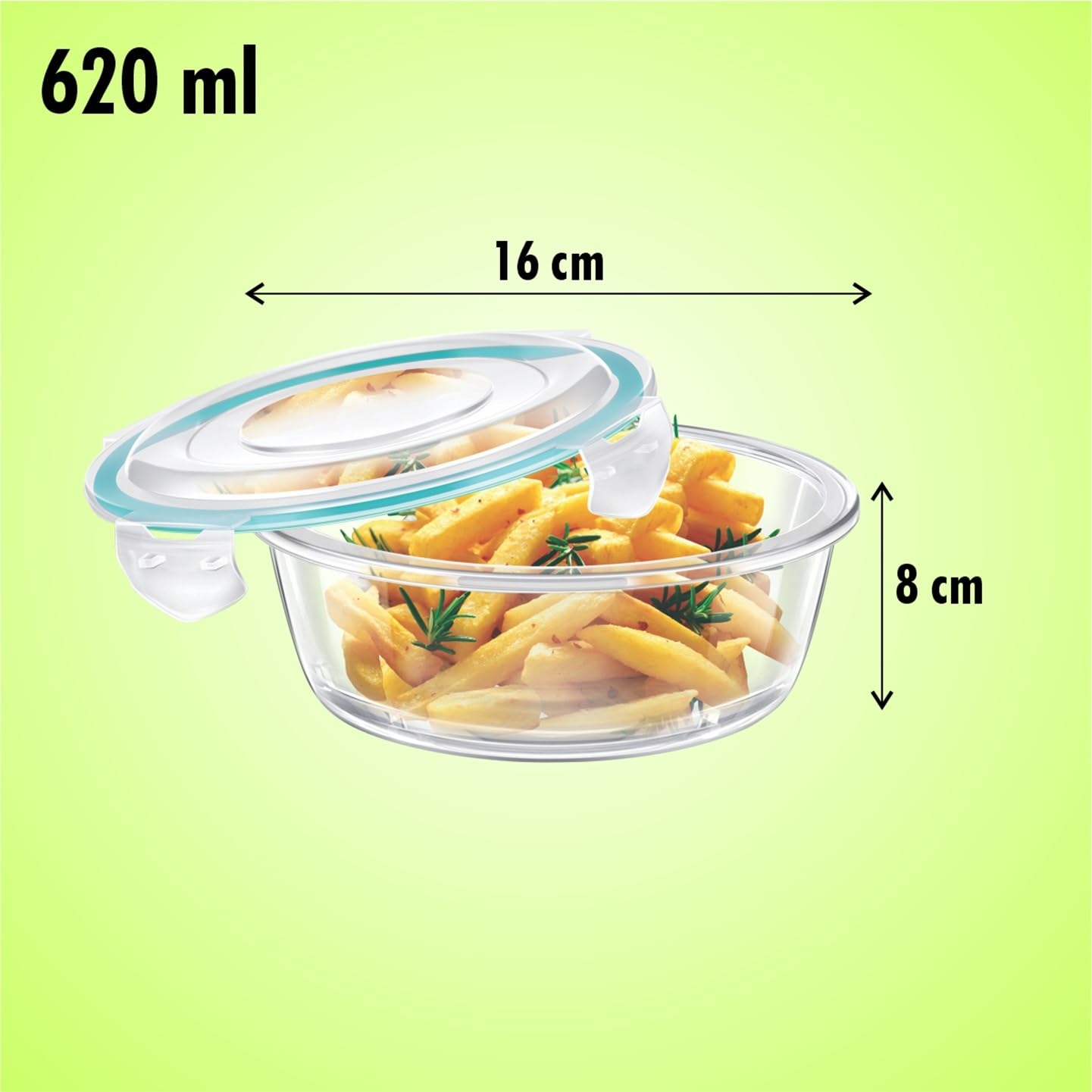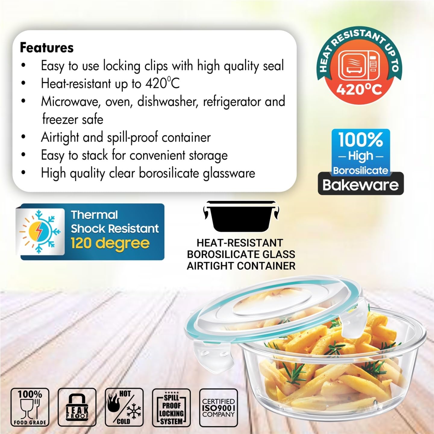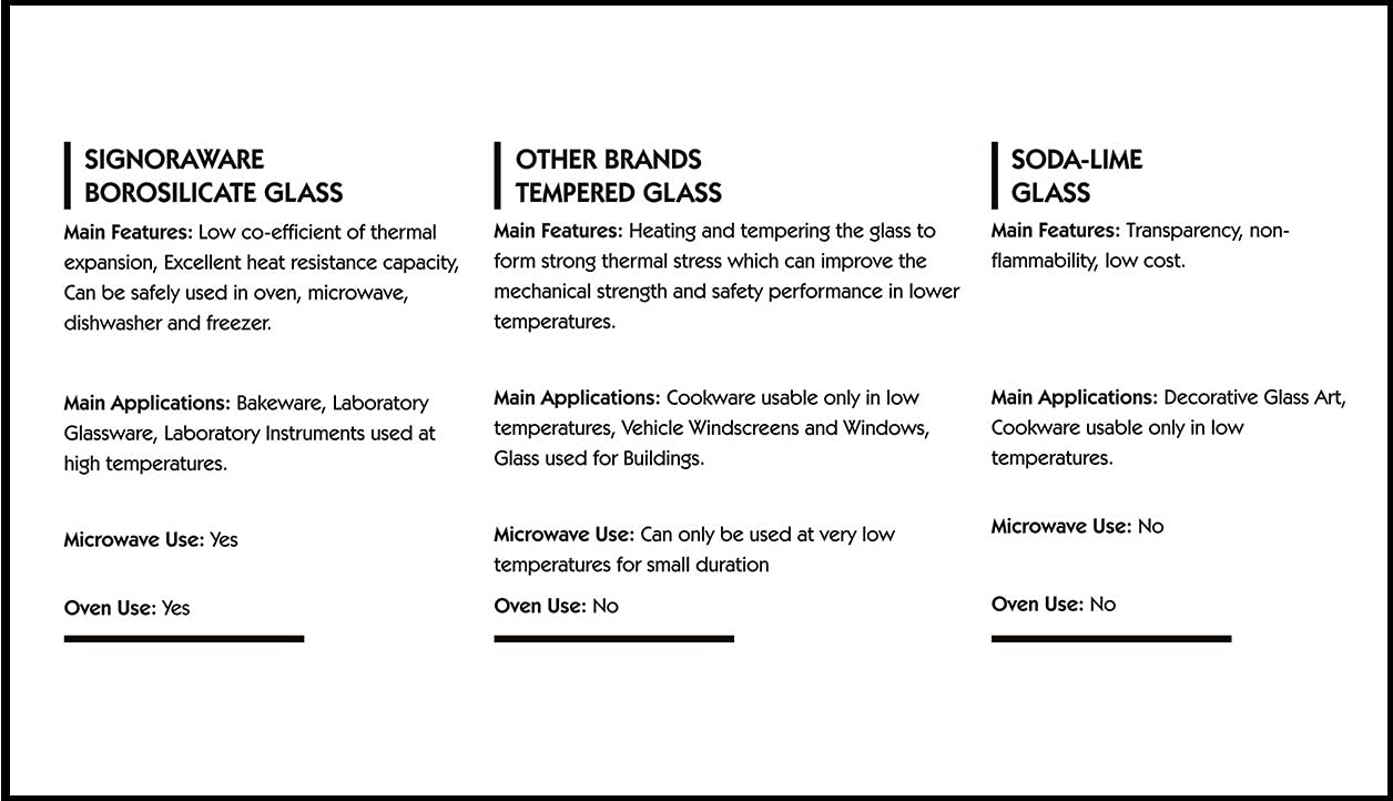Heat resistant up to 420°C, stackable for convenient storage 100 percent microwave safe and 100% Borosilicate Glass , oven, dishwasher and freezer proof Gives your kitchen a modern and stylish look with 100-percent food grade and microwave safe, B.P.A free Modern look, see through glass like look, exceptional gift idea Color: Clear, Material: Glass