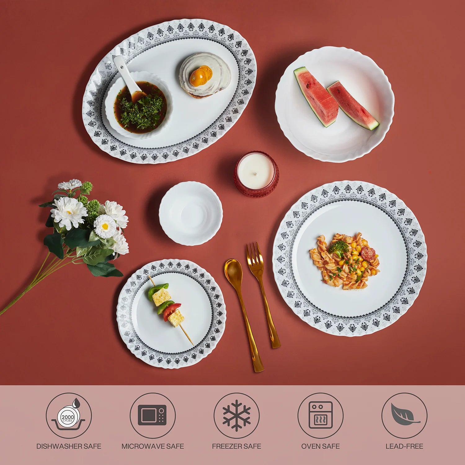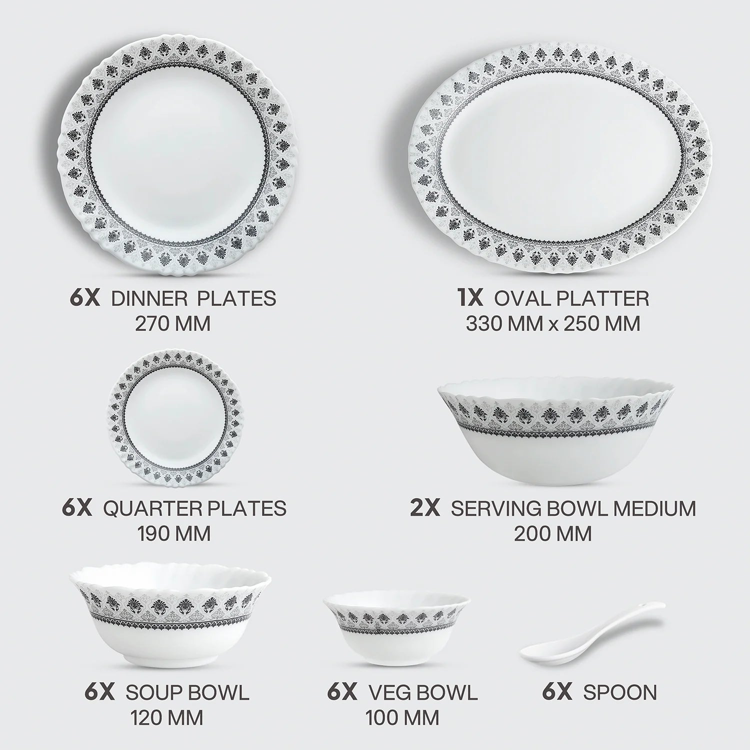Bring timeless elegance to your table with the Imperial Plus Damask Opalware Dinner Set — a perfect blend of sophistication and durability. Crafted from premium opalware, this set is lightweight, scratch-resistant, chip-resistant, and designed for everyday convenience. Available in 27-piece and 33-piece options, it includes full plates, quarter plates, veg bowls, soup bowls, serving bowls, and an oval platter for a complete dining experience. Ideal for festivals, pujas, or family gatherings, this set enhances every celebration with style and grace.