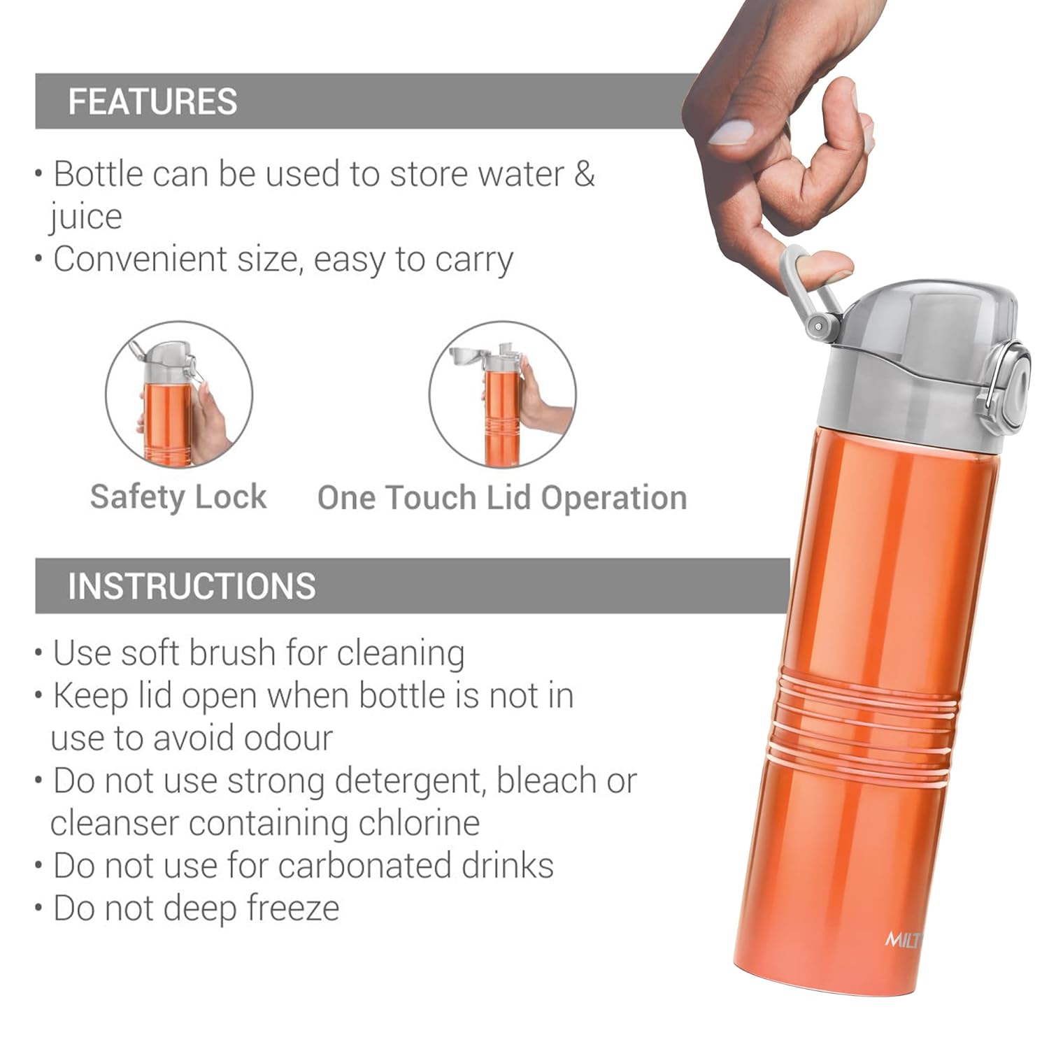 High-quality stainless steel Vogue bottle with one-touch mechanism to unlock lid. Stylish and perfect for sports, serving, and storing drinks. Convenient size for easy carrying in bags or car bottle holders. Highly durable and can withstand daily use. Ergonomic design for easy pouring and one-touch lid to shield spout from dust. Vogue spout lid (without sipper).
