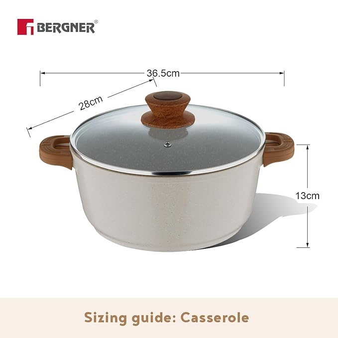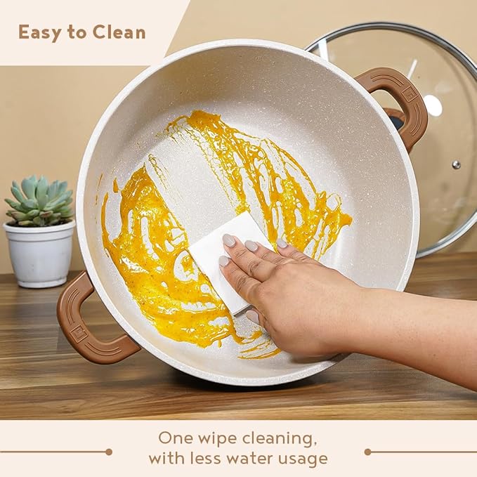 Experience effortless cooking with the Wonderchef Granite Non-Stick Casserole, crafted from durable, food-grade cast aluminum for superior strength and even heat distribution. Its PFOA-free, multi-layer non-stick coating ensures healthy, low-oil cooking and easy cleanup. Designed with a marble-inspired white granite finish, it adds a modern touch to your kitchen. Compatible with all cooktops, including induction, it features a transparent glass lid for easy monitoring and a soft-touch, heat-resistant handle for comfort. Comes with a free non-woven trivet for added convenience.