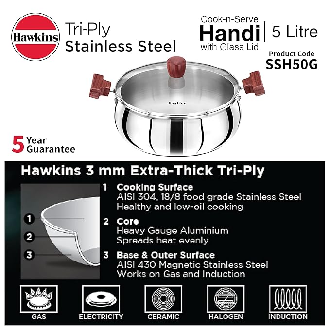 Hawkins Tri-ply Stainless Steel Cook n Serve Handi is designed to give you all the advantages of cooking in stainless steel while minimizing the disadvantages of sticking and burning that are normally associated with ordinary stainless steel. The cooking surface (inner surface) is made from 18/8 food-grade (AISI 304) stainless steel which is extremely hygienic, most durable, does not react with most foods and does not pit or corrode. The heavy gauge aluminium core spreads heat well for even cooking with no hot spots, and retains heat for quick cooking. It is sandwiched between two layers of stainless steel and...