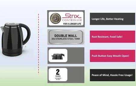 The 304 stainless steel inner body guarantees durability and rust resistance, while the cool-touch outer body provides safe handling even when the kettle is hot. Its 360° cordless base allows for easy placement and convenient pouring from any angle.