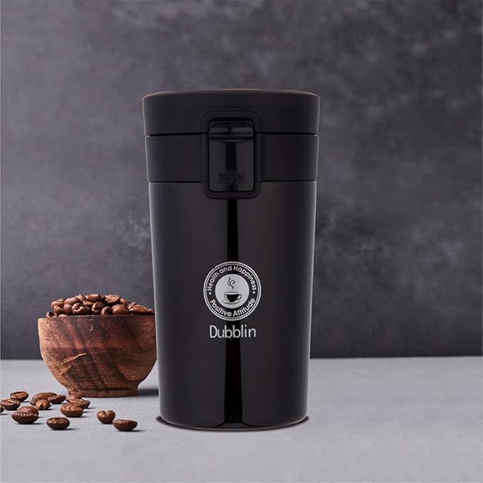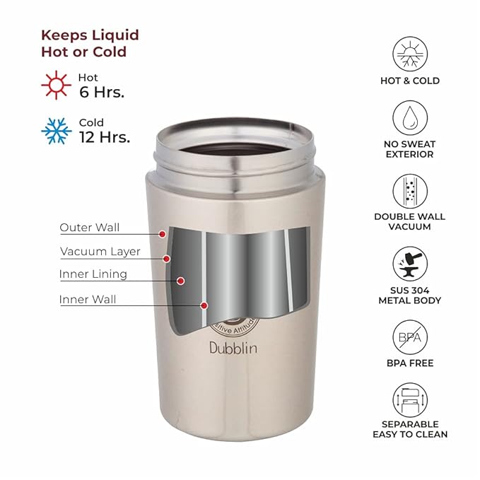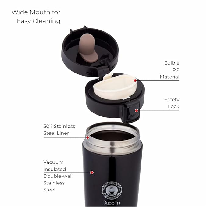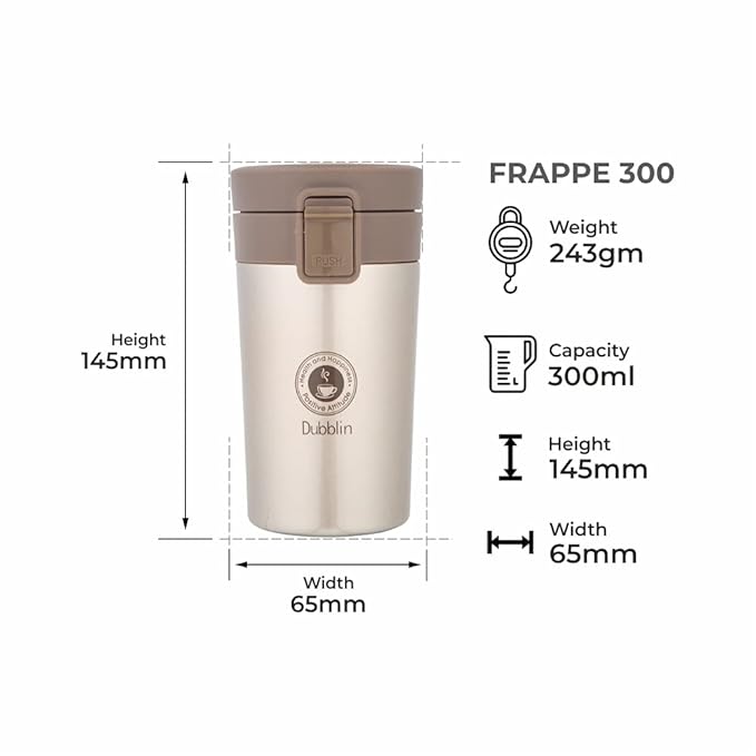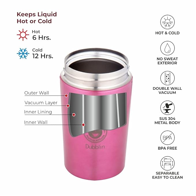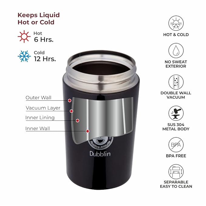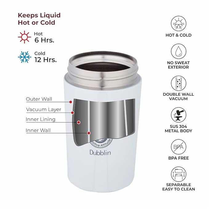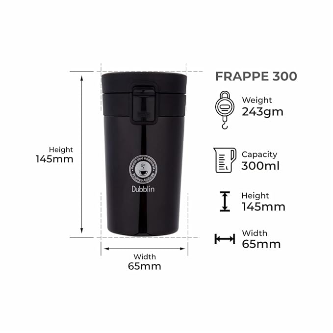 Dubblin Frappe Mug is made from 304 stainless steel. This insulated double-walled vacuum mug is designed for maximum temperature retention that keeps your favorite drinks hot/cold without altering their temperatures for a prolonged period of time. It will keep your drinks just the way you need them .It is designed to fit in the cupholder of most cars. The leak proof lid has a tight seal to keep the beverages secure, and operates with a simple touch. The taste and nutritive value of the drinks remain intact for a long time making the mug a very appropriate choice for storing/...