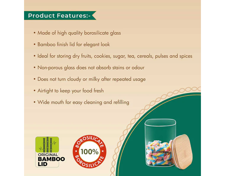 Material Details: The Trison Jar with Bamboo Lid is crafted from high-quality borosilicate glass, a material renowned for its exceptional durability and heat resistance. This type of glass can withstand significant temperature fluctuations, making it perfect for both hot and cold storage. The lid is made of durable steel, ensuring a secure and airtight seal. Best Usage:This versatile jar is ideal for storing a wide range of food items, including: Dry Goods: Tea leaves, coffee beans, sugar, flour, and spices. Wet Goods: Jams, jellies, honey, and sauces. Perishable Items: Fruits, vegetables, and leftovers. Its airtight seal helps to preserve the...