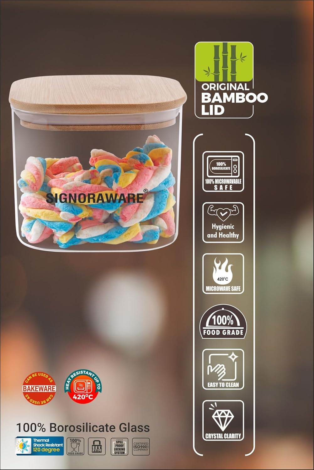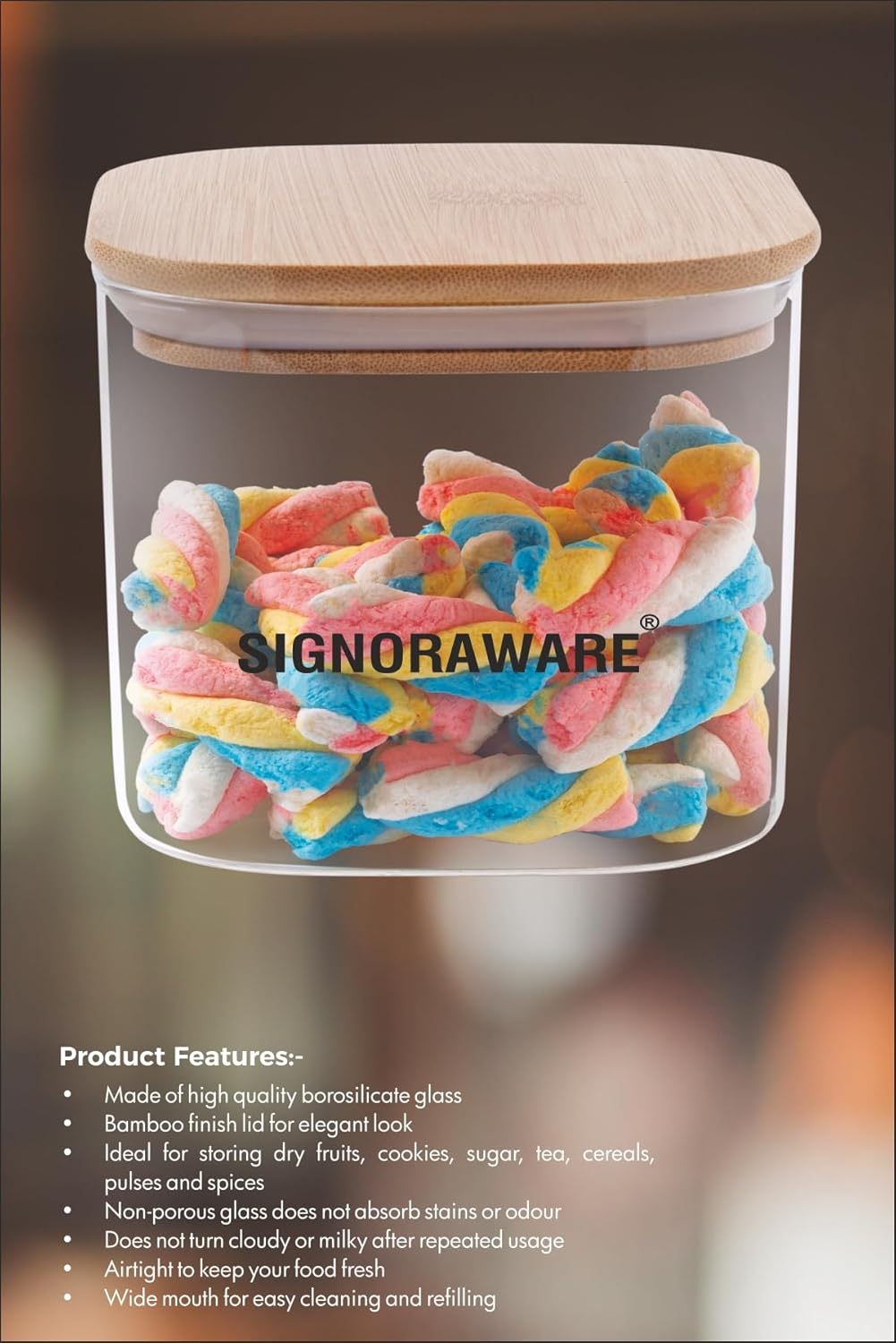 Signoraware Trison Borosilicate Glass Square Jar | Food Storage container with Airtight Bamboo Lid | Multipurpose | For wet and Dry Storage | Easy to Clean | Heat Resistant | (700ml | Clear)