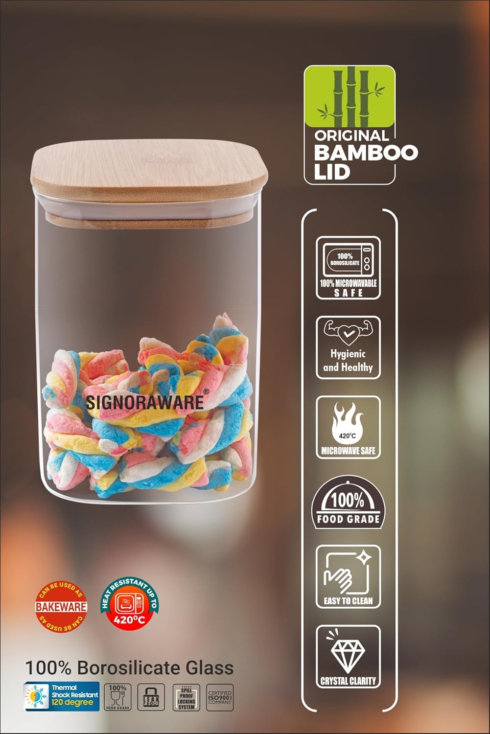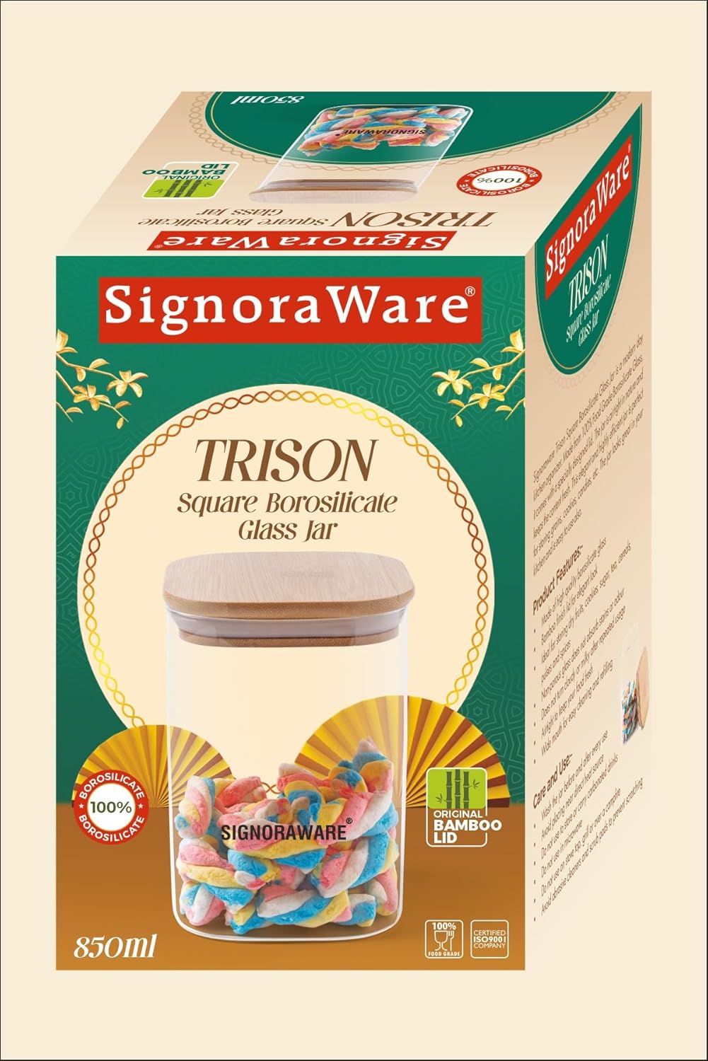 Signoraware Trison Square Jar With Bamboo Lid 850 mlSignoraware Trison Borosilicate Glass Square Jar | Food Storage container with Airtight Bamboo Lid | Multipurpose | For wet and Dry Storage | Easy to Clean | Heat Resistant | (850ml | Clear)